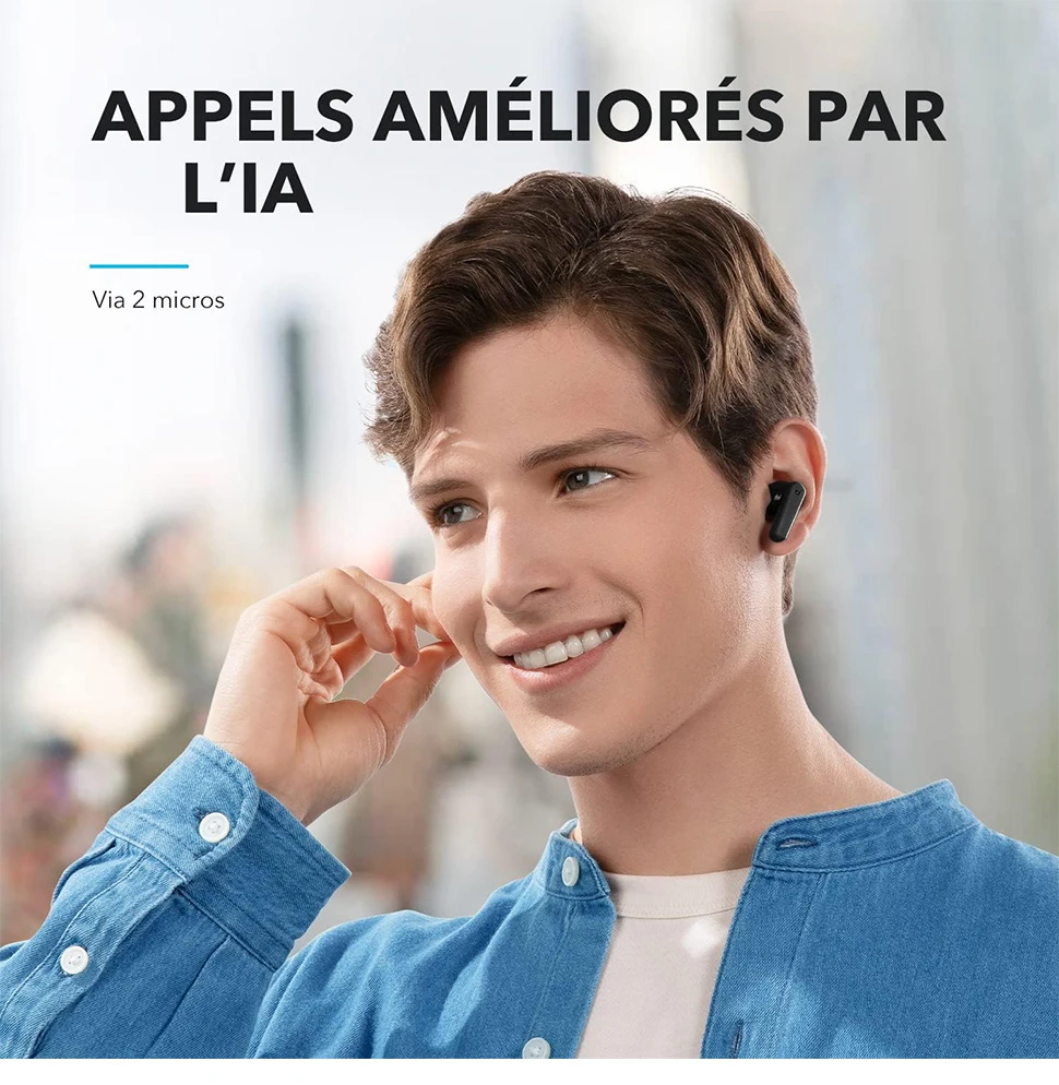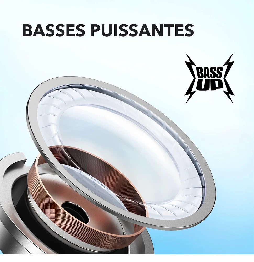 Appels nets avec IA + 2 micros, connexion Bluetooth 5.3 ultra-stable, app Soundcore avec 22 EQ personnalisables.